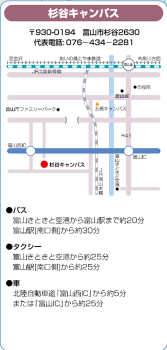 富山地方鉄道バス「金屋口」まで徒歩約3分。「金屋口」から「富山駅前」までバスで約16分。 あいの風とやま鉄道「富山駅」から「高岡駅」まで電車で約20分。 加越能バス「高岡駅」から「城光寺運動公園」行きで「富大高岡キャンパス」までバスで約20分。