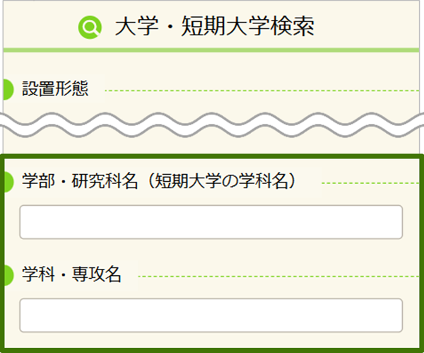 ①:検索画面(トップページ)の「学部・研究科名」か「学科・専攻名」の欄に、興味のあるキーワードを入れる