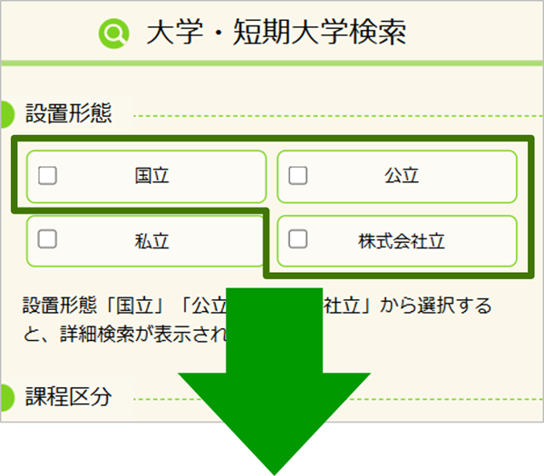 ①:検索画面(トップページ)の「設置形態」で、「国立」「公立」「株式会社立」のどれかを選択