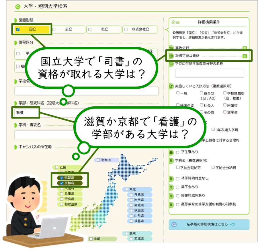 学びたい分野、取れる資格、入試方法、学生寮、奨学金などで検索ができます。